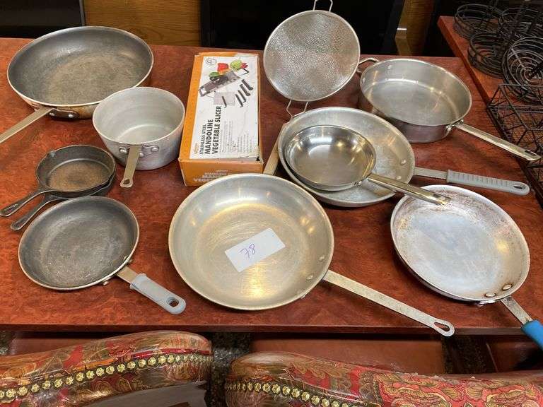 LOT 78 - Lot of sauce pans including strainer. Two cast-iron valor, cooking pans.